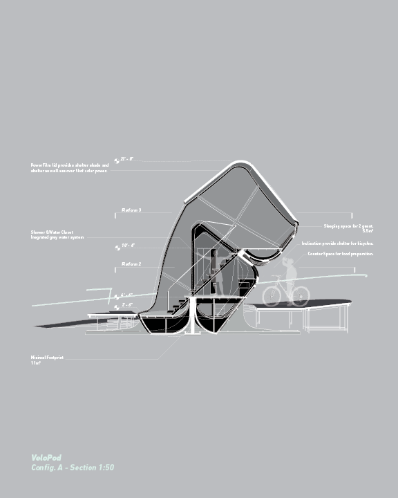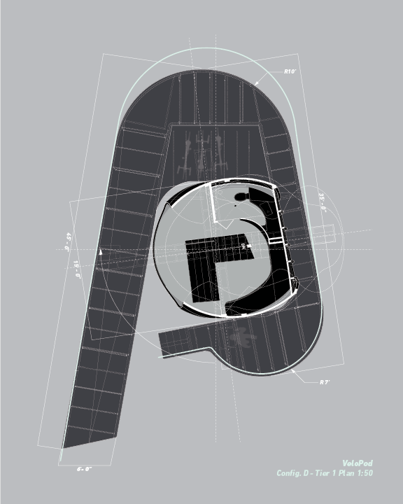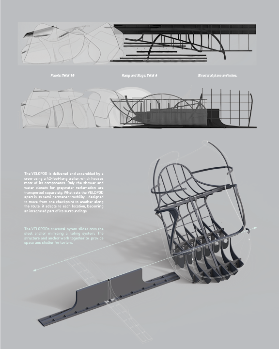 The VELOPOD is a mobile rest stop inspired by the design language of modern bicycles, resulting in a replicable, efficient structure. Though its mobility is limited, it embraces the concept of compact living on the move—serving both as a space for rest and repair, and as a beacon for social interaction and urban escape.